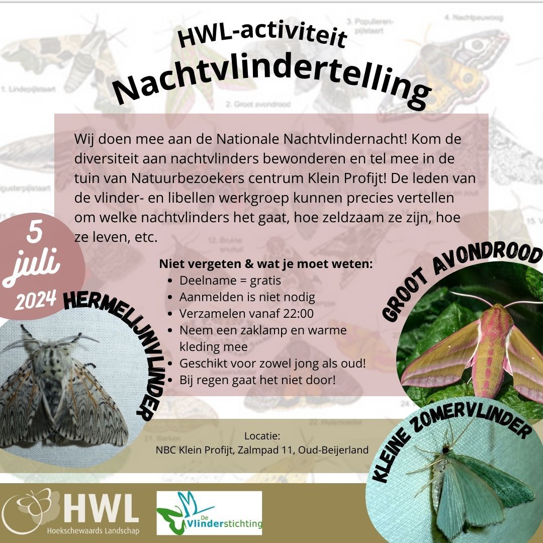In de nacht van 5 op 6 juli gaat de vlinder- en libellenwerkgroep weer nachtvlinders tellen. Het is namelijk de Nationale Nachtvlindernacht, een initiatief van de Vlinderstichting, daar doen wij uiteraard aan mee! We starten bij zonsondergang. De zonsondergang op 5 juli wordt verwacht omstreeks 22.00 uur in de tuin achter NBC Klein Profijt, Zalmpad 11, Oud-Beijerland.