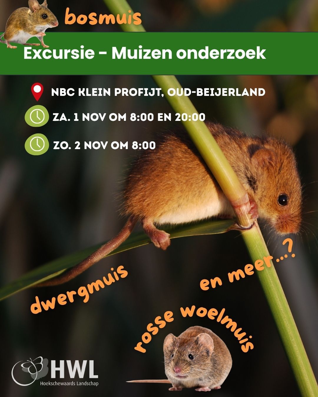 Grijp je kans om muizen van dichtbij te zien en misschien wel te horen! Ga mee op pad rond NBC Klein Profijt en help mee met de muizeninventarisatie.