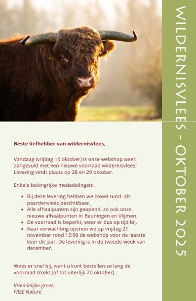 Opgelet: er is t/m 20 oktober wildernisvlees te bestellen bij FREE Nature (o.a. ophaalpunt bij NBC Klein Profijt)🐴🐂