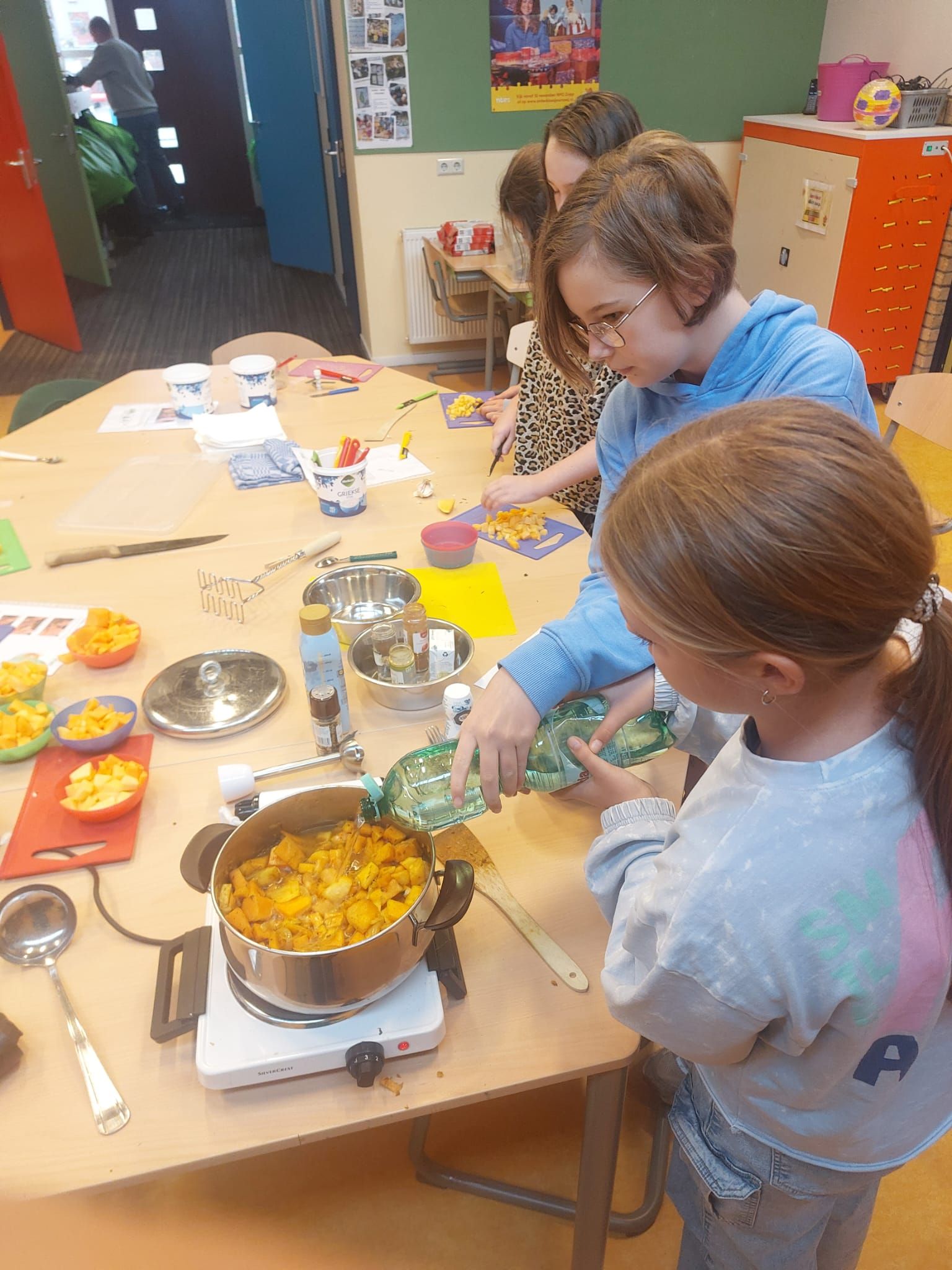 Met pompoenen uit de eigen schooltuin maakten de leerlingen twee soorten soep. Onder begeleiding van moestuinjuf Gaëlle, en twee topvrijwilligers Carla en Danny, werden er uien gesnipperd, knoflook en gember gesneden én pompoenen geschild – keukentalenten in de dop!
